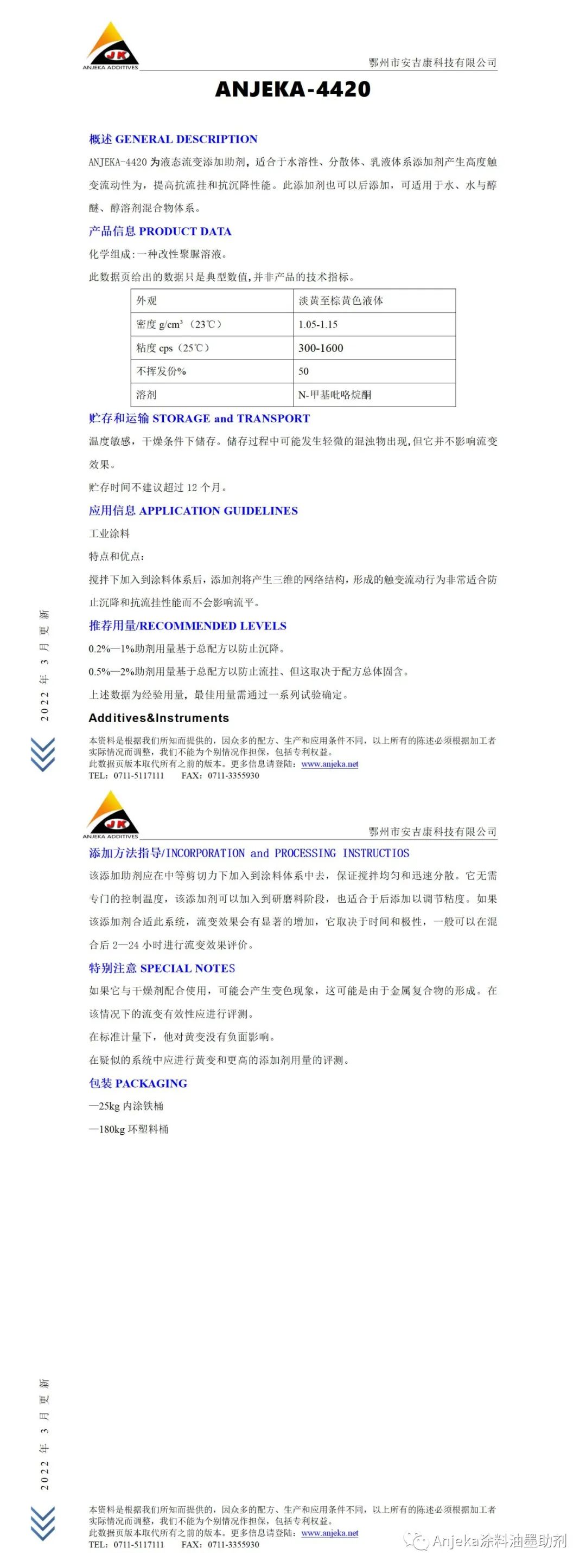 安吉康4420水性聚脲觸變劑,抗流掛、防止沉降重防腐涂料,金屬顏料定向劑可替代BYK420