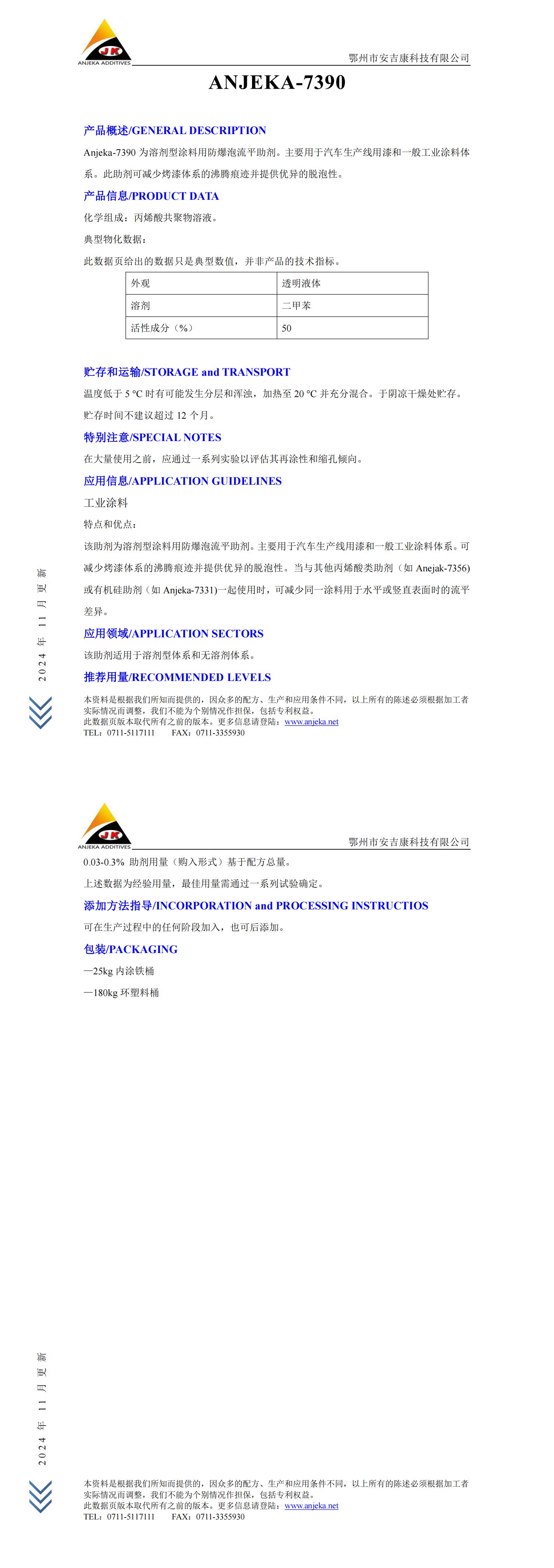 Anjeka-7390 為溶劑型涂料用防爆泡流平助劑。主要用于汽車生產(chǎn)線用漆和一般工業(yè)涂料體系。此助劑可減少烤漆體系的沸騰痕跡并提供優(yōu)異的脫泡性。